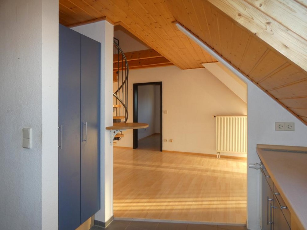 Wer das Außergewöhnliche und Holz liebt – wird sich hier wohlfühlen! Die große Einbauküche mit allen elektronischen Markengeräten, Schränken und Schubladen hat alles was man zum Kochen benötigt – hier macht Kochen Spaß! Der Bodenbelag ist fast komplett (außer Küche+ Bad) mit Laminat, ausgestattet ( hier sind Abnutzungsspuren). Treppichboden im ersten Schlafzimmer und im Galeriebereich. In der Wohnküche sowie im Essbereich und im Dielenbereich sind Bodenfliesen verlegt. Großes neutrales Badezimmer mit Badewanne, separate Dusche, WC und Waschbecken mit Spiegelschrank; ist raumhoch gefliest. Balkon mit Markise und Holz Belag. Zur Wohnung gehören: 2 Autoabstellplätze im Freien. Einen großen gemauerten Keller. Zur Mitbenutzung steht ein Waschraum zur Verfügung. Bitte beachten: Kein neuwertiger Bodenbelag! Zur Wohnung gehört die EBK und der Spiegelschrank sowie die schmalen Schränke im Bad! Durch die offene und interessante Architektur sind nur zwei abgeschlossene Zimmer – deshalb ist es für 2 Personen am besten geeignet! Vermietungspreis Euro 980,00,- zuzügl. 40,- Euro für 2 AA + Nebenkosten Euro 300,- ( diese beinhalten: Heizung, Wasser, Abwasser usw., Versicherung, Kabel TV, allgemein Strom, Grundsteuer usw.)+ 3 MM Kaution. Bitte beachten: Keine Katzen erwünscht!
